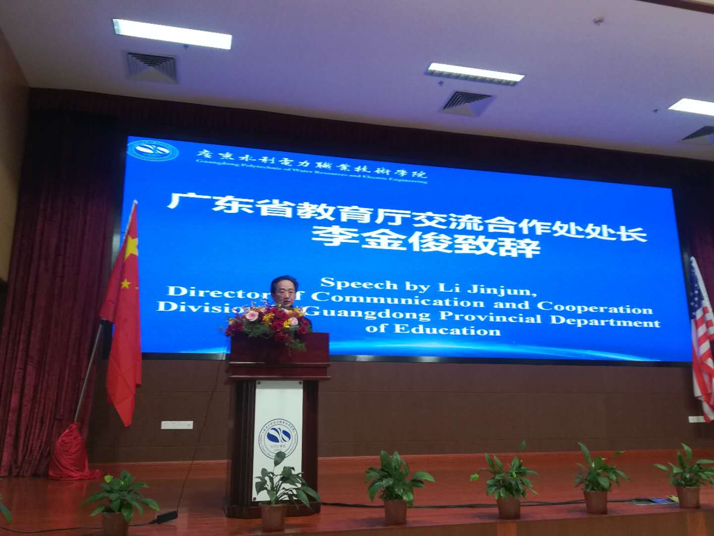 10月16日下午,中美高等职业教育论坛暨广东水利电力职业技术学院杰克逊国际学院揭牌仪式在我院从化校区学术交流中心举行。这是学校发展史上值得庆贺的日子,也是广东省高职院校国际化发展进程中的又一喜讯。中国教育国际交流协会涉外办学质量保障部副主任唐振福博士、广东省教育厅交流合作处处长李金俊、广州工程职业技术学院院长王运泉、各兄弟院校的同仁们以及学院师生参加了此次盛会。